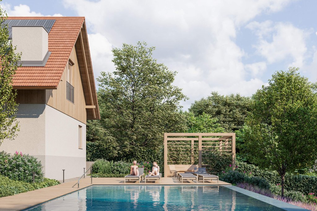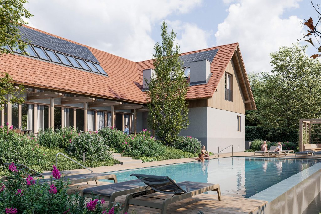 Zasebni wellness: Vsaka hišica se odpira na vzhodno nadkrito teraso, ki je opremljena z zasebnim masažnim bazenom.